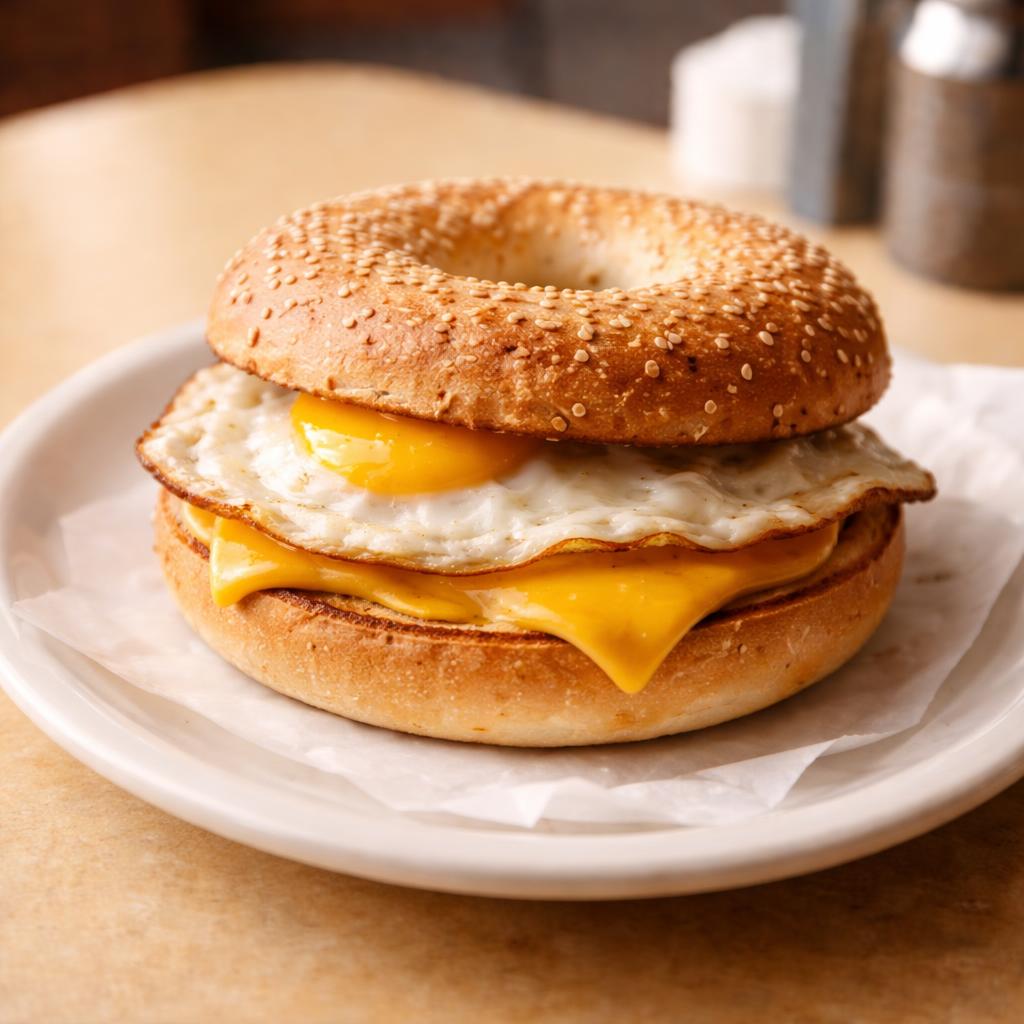 Fried egg and melted American cheese on a toasted bagel. Working man's breakfast since forever.