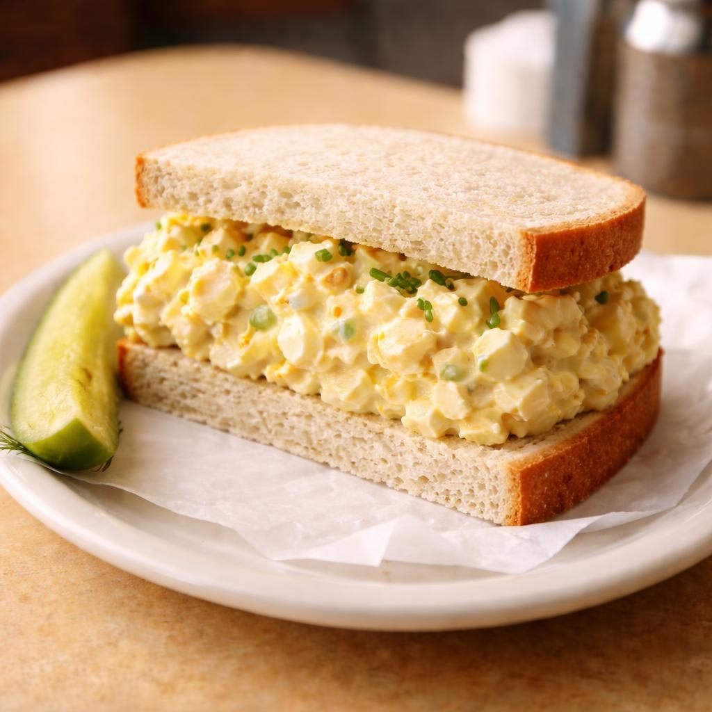 Old-fashioned egg salad made fresh daily with mayo, celery, and a pinch of paprika on soft white bread. Grandma's recipe.