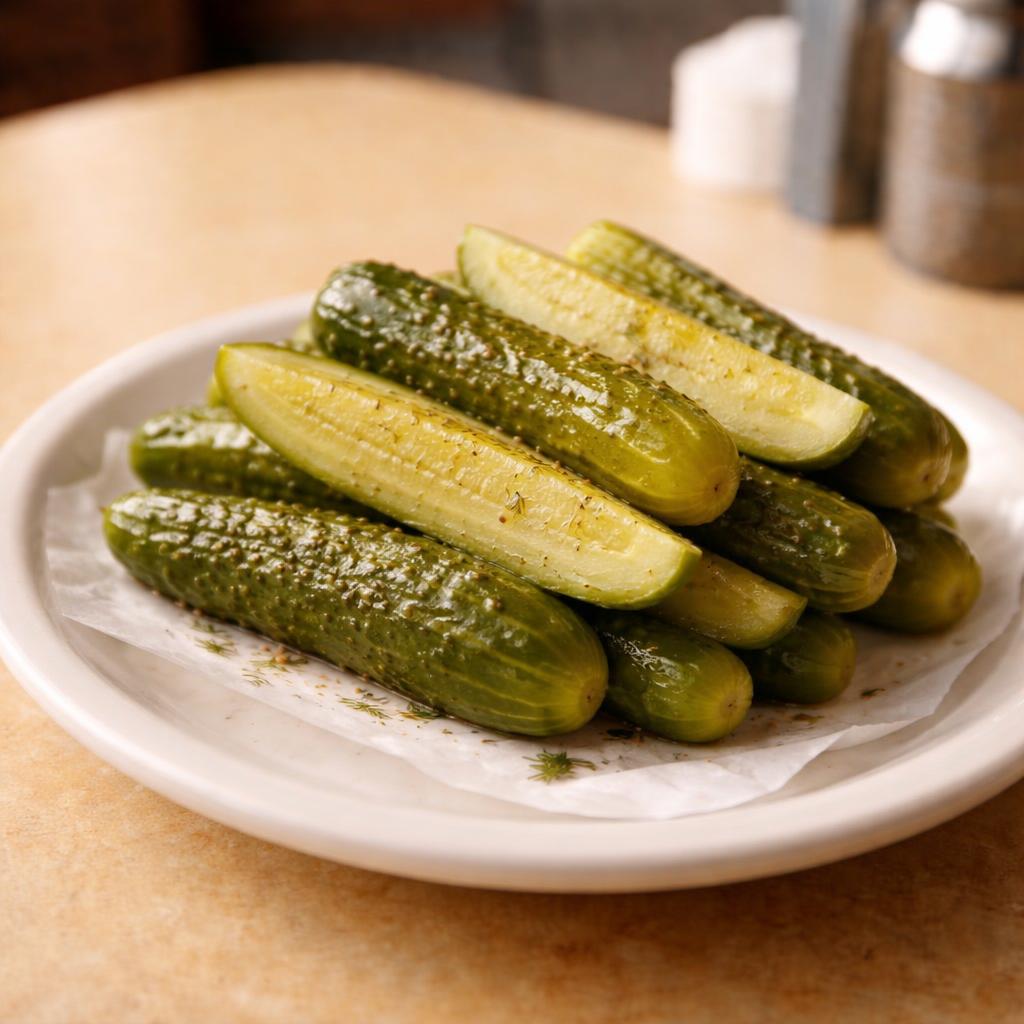 Barrel-fermented half-sour pickles with garlic and dill. Not too sour, not too sweet, just right.