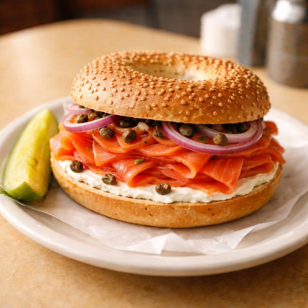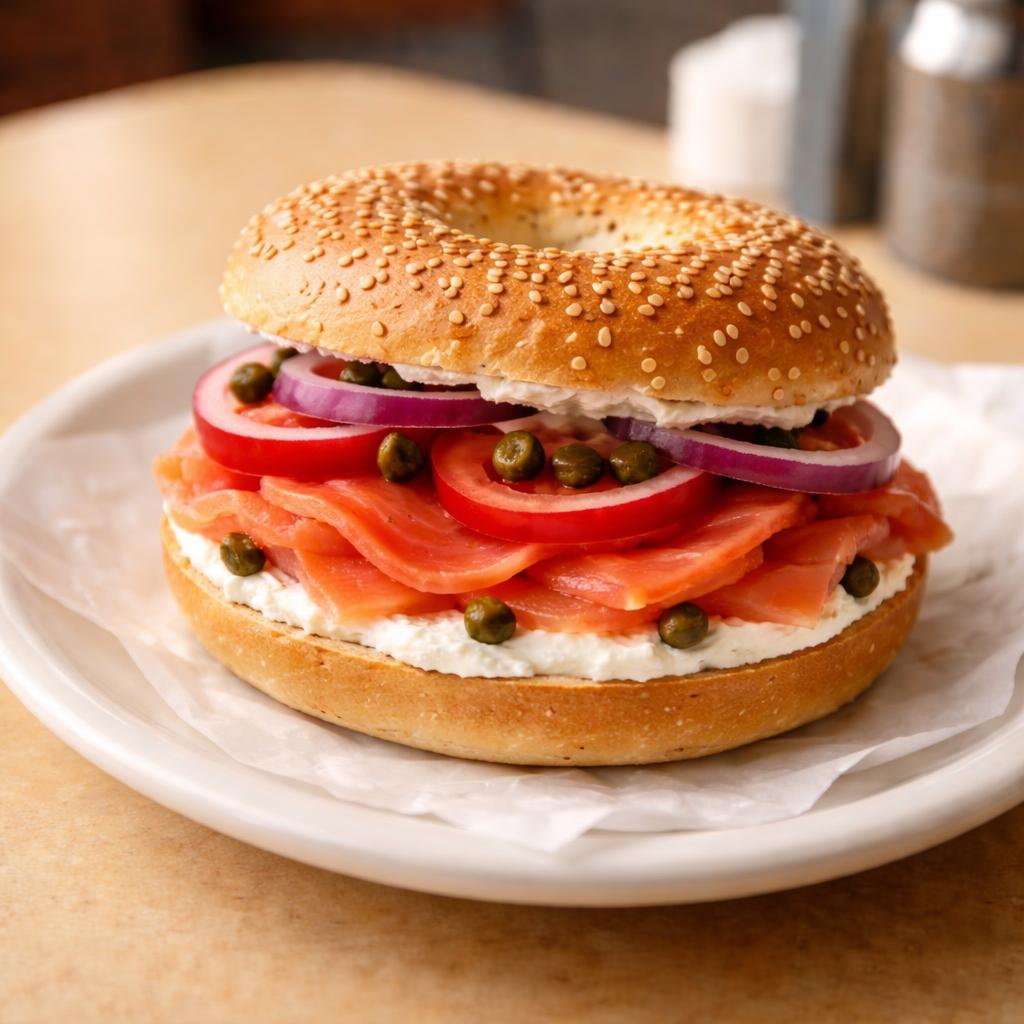 Hand-sliced Nova lox draped over schmear of cream cheese, tomato, red onion, and capers on a toasted bagel. The real deal.