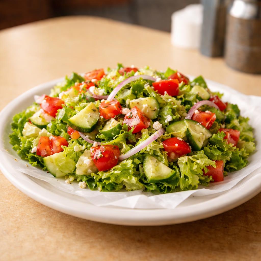 Crisp iceberg lettuce, tomatoes, cucumbers, red onion, and carrots chopped fine and tossed with house Italian dressing.
